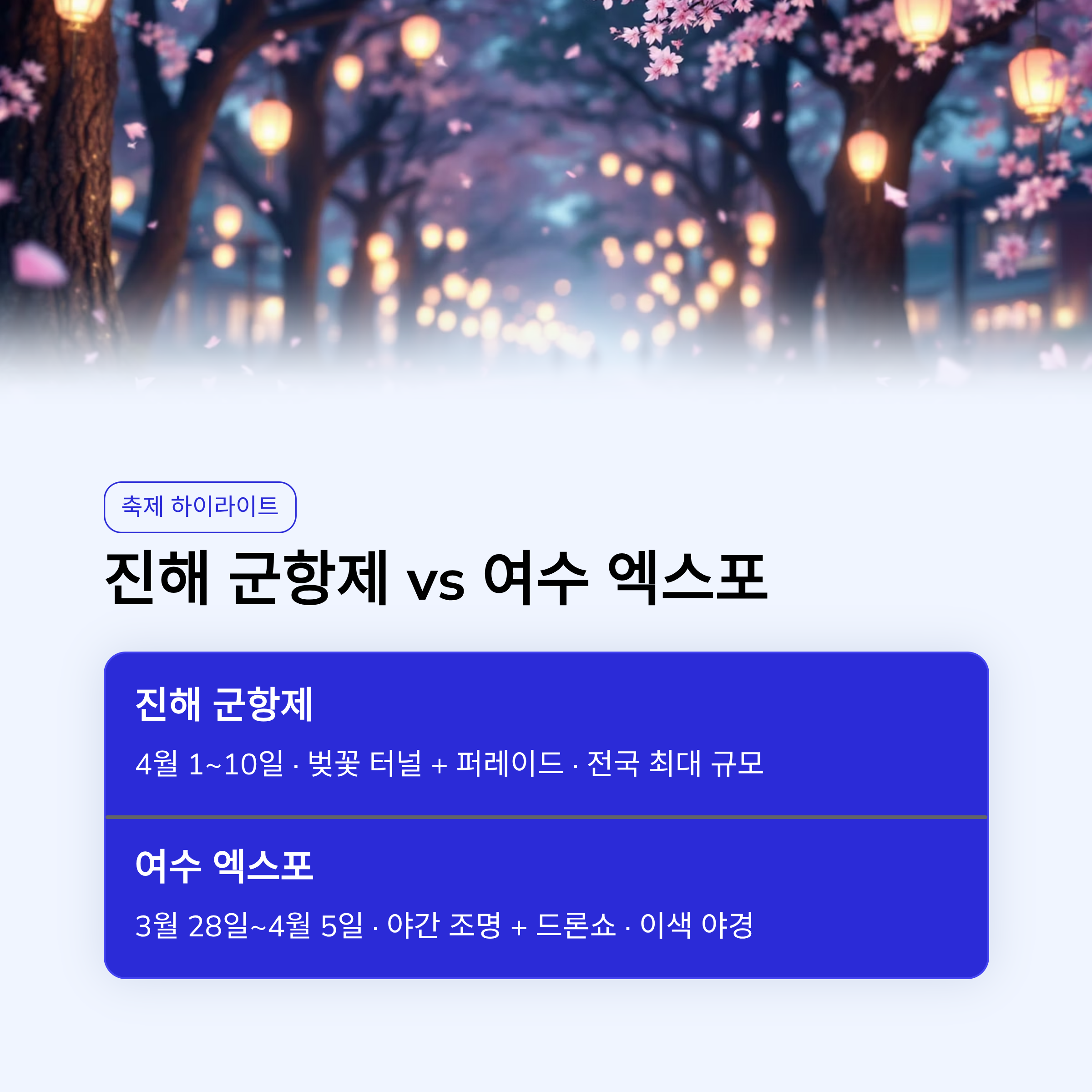 | 여수 엑스포 벚꽃축제 | 전남 여수 | 3월 28일~4월 5일 | 야간 조명, 드론쇼 |