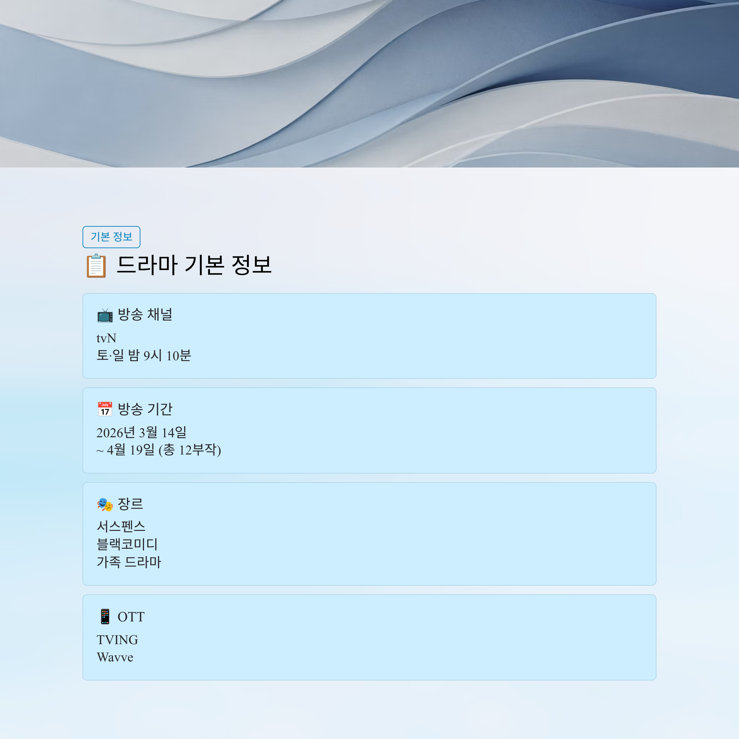 - 방송 기간: 2026년 3월 14일 ~ 4월 19일