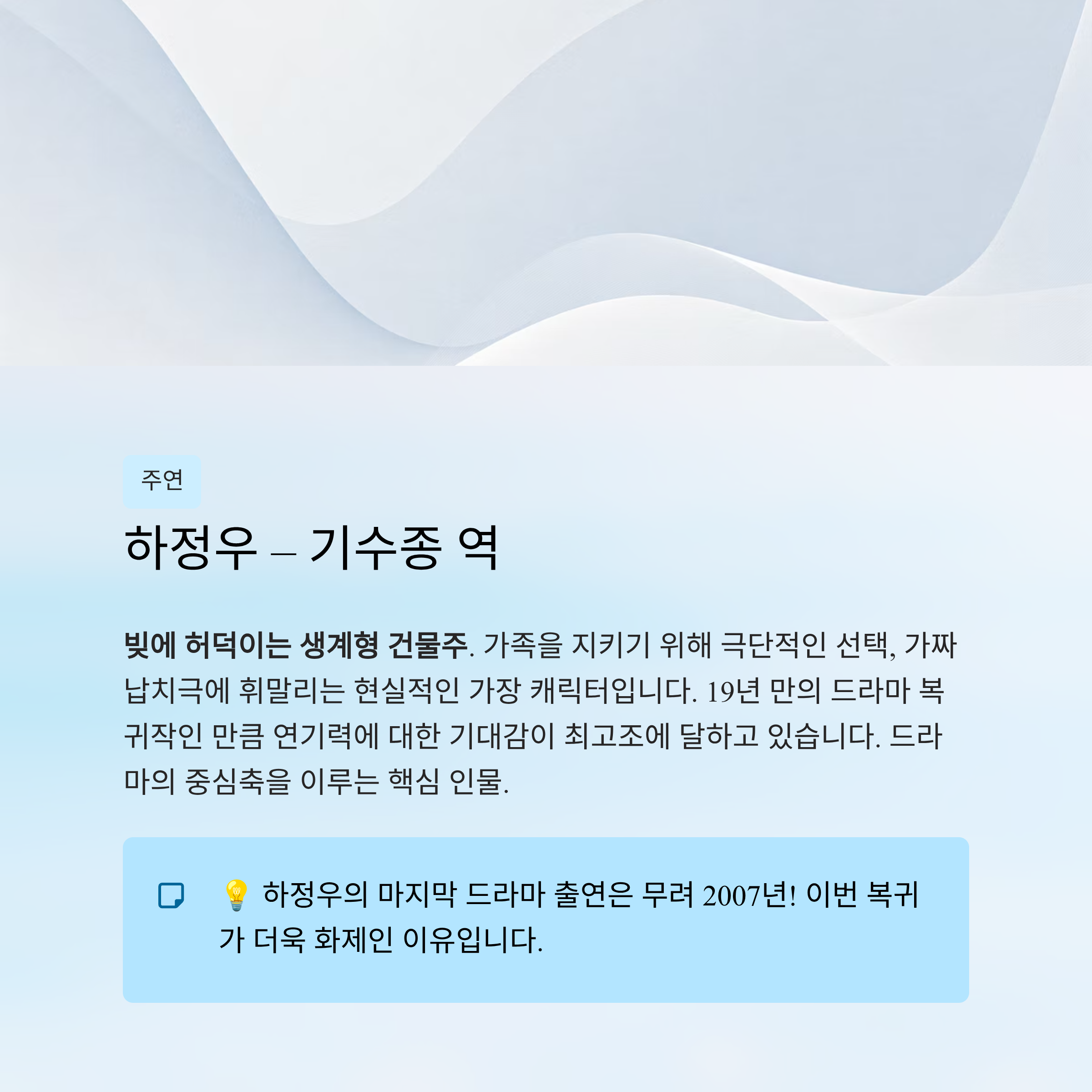 특히 하정우의 19년 만의 드라마 복귀작으로 더욱 주목받고 있습니다.